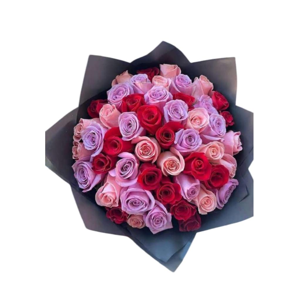 Este impresionante ramo de rosas frescas combina la pasión del rojo, la dulzura del rosa y la delicadeza del lila, creando un arreglo floral elegante y romántico. Envuelto en papel negro, resalta la intensidad y el contraste de los colores, perfecto para transmitir amor, gratitud o admiración.